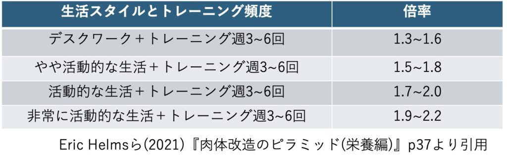 例えば、筆者の場合はデスクワークメインで、トレーニングを週3程度なので、1.3~1.6倍を掛けようという感じですね。