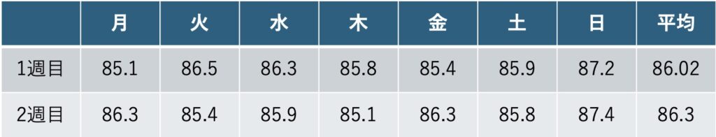 一般的に最適な減量のペースは、1週間あたり0.5~1%の体重減少になりますのでこの範囲で設定をすることをお勧めします。