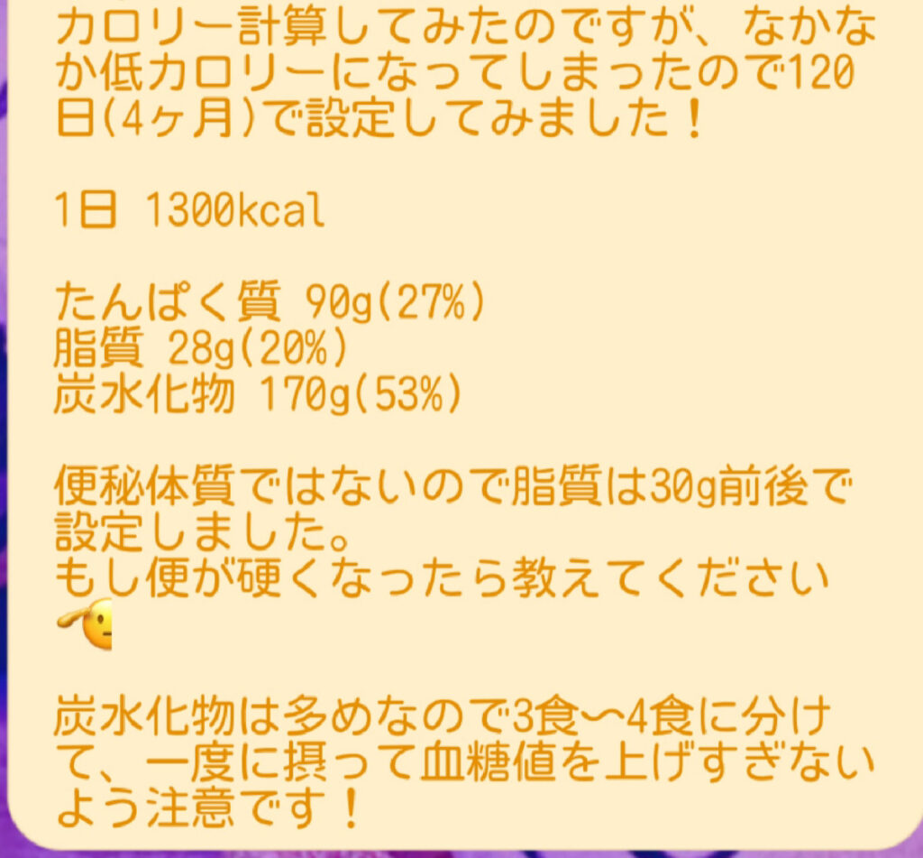 また、別のお客様は明確に〇㎏減量の目標に向かってカロリー設定。